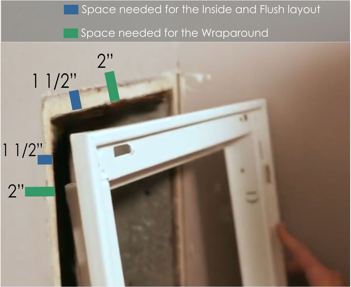 The metal frame box included with the Stellar Air vent will be inserted in the drywall and it will expand 1 1/2” on your wall, so make sure you have at least 1 1/2” of space from the edge of the opening to the base molding or chair molding in order to fit an Inside or Flush Layout. You will need 2” of space around the duct opening for the Wraparound Layout.